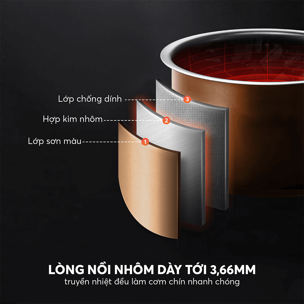 – Lòng nồi với độ dày 1.2mm giúp nhiệt độ được truyền đều khắp bề mặt, khiến cơm chín đều, ngon.